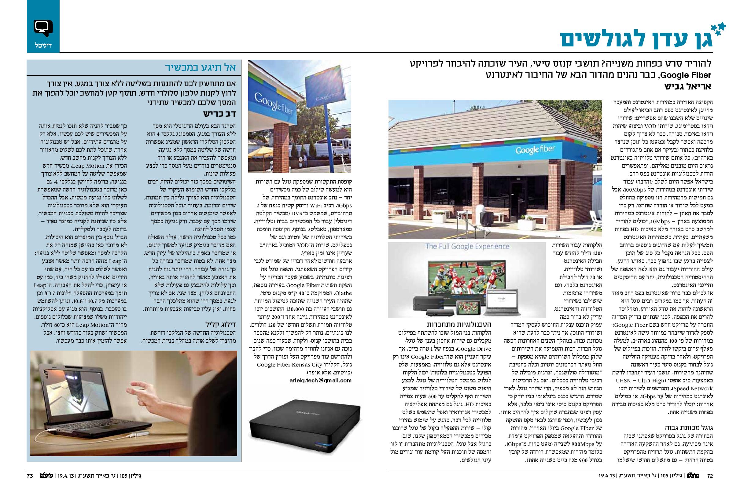 הקפיצה האדירה במהירות האינטרנט והמעבר מחייגן לאינטרנט בפס רחב הביאו לעולם שינויים שלא חשבנו שהם אפשריים: שידורי וידאו בסטרימינג, שירותי VOD וביצוע שיחות וידאו באיכות סבירה. כבר לא צריך לקום מהספה ואפשר לקבל (כמעט) כל תוכן שנרצה בלחיצת כפתור (בעיקר אם אתם מתגוררים בארה"ב). כל אותם שירותי טלוויזיה באינטרנט נראים היום מובנים מאליהם, ומתאפשרים הודות לטכנולוגית אינטרנט בפס רחב. בישראל אפשר היום לשלם (והרבה) עבור שירותי אינטרנט במהירות של 100Mbps (מגה-ביט לשנייה) אבל גם מהירות של 20Mbps מספיקה בהחלט כמעט לכל שידור או הורדה שתרצו. רק כדי לסבר את האוזן – לקוחות של אינטרנט במהירות 10Mbps יכולים להוריד למחשב סרט באורך מלא באיכות HD (קובץ בגודל של כ-4 ג'יגה-בייט) בפחות משעתיים. בעתיד, כשמהירות האינטרנט תמשיך לעלות עם שדרוגים נוספים ברוחב הפס, לא נצטרך בכלל להוריד שום דבר – כבר היום יש מדינות בעולם בהן אפשר לגלוש במהירות של 1Gbps (ג'יגה-ביט לשנייה) – מהיר פי 100 מאותם 10Mbps, שהיא המהירות הממוצעת היום בארץ. מהירות של 1Gbps מאפשרת להוריד סרט בנפח של 4 ג'יגה-בייט בפחות משתי שניות ! השימוש באינטרנט באמצעות הסמארטפון הפך לנדבך כה חשוב ויום-יומי בחיינו, שיש מי שבוחר בשירותים של חברה סלולרית זו או אחרת בהתאם לאיכות האינטרנט הסלולרי שהיא מספקת. לכולם כבר ברור שאינטרנט בפס רחב הוא העתיד, וכמו במקרים רבים, גוגל היא הראשונה שמרימה את הכפפה. בדיוק לפני שנתיים הכריזה החברה על פרויקט חדש בשם Google Fiber: לספק לקהילה אחת גישה לאינטרנט במהירות פי 100 מהנהוג בארה"ב. 1,100 ערים ביקשו להיות הזוכה בפיילוט של הפרויקט, ולאחר בדיקה מעמיקה החליטה גוגל לבחור בקנזס סיטי כעיר ראשונה שתהנה משירותי אינטרנט בפס רחב באמצעות סיב אופטי (UHSN – Ultra High-Speed Network) במהירות של עד 1Gbps.