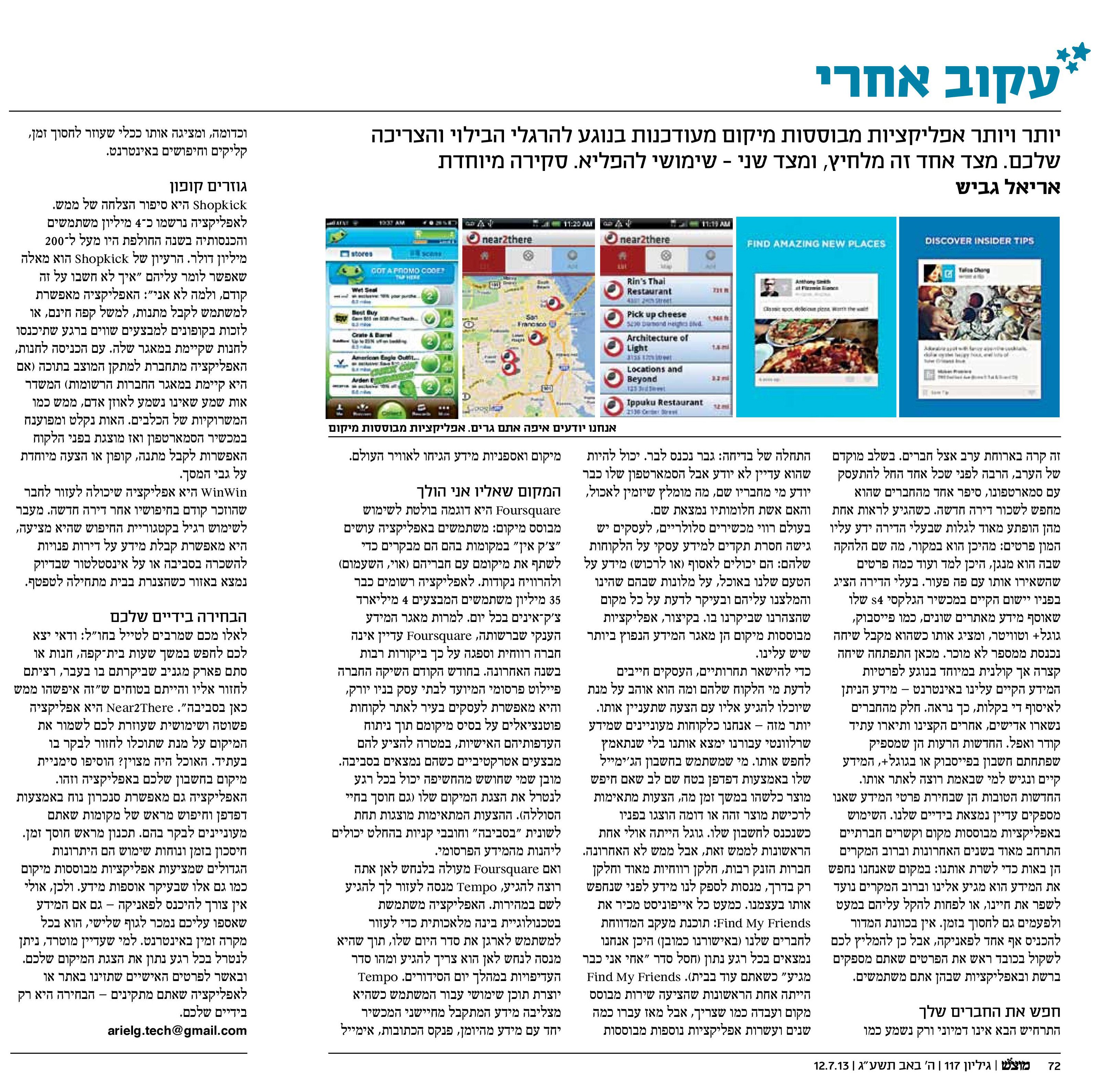 כדי להישאר תחרותיים, העסקים חייבים לדעת מי הלקוח שלהם ומה הוא אוהב על מנת שיוכלו להגיע אליו עם הצעה שתעניין אותו. יותר מזה – אנחנו כלקוחות מעוניינים שמידע שרלוונטי עבורנו ימצא אותנו מבלי שנתאמץ לחפש אותו. מי שמשתמש בחשבון הג'ימייל שלו באמצעות דפדפן בטח שם לב שאם חיפש מוצר כלשהוא במשך זמן מה, הצעות מתאימות לרכישת מוצר זהה או דומה הוצגו בפניו כשנכנס לחשבון שלו. גוגל הייתה אולי אחת הראשונות לממש זאת, אבל ממש לא האחרונה. חברות הזנק רבות, חלקן רווחיות מאוד וחלקן רק בדרך, מנסות לספק לנו מידע לפני שנחפש אותו בעצמנו. כמעט כל אייפוניסט מכיר את Find My Friends: תוכנת מעקב המדווחת לחברים שלנו (באישורנו כמובן) היכן אנחנו נמצאים בכל רגע נתון (חסל סדר "אחי אני כבר מגיע" כשאתם עוד בבית). Find My Friends הייתה אחת הראשונות שהציעה שירות מבוסס מקום ועבדה כמו שצריך, אבל מאז עברו כמה שנים מאז ועשרות אפליקציות נוספות מבוססות מיקום ואספניות מידע הגיחו לאוויר עולם.
