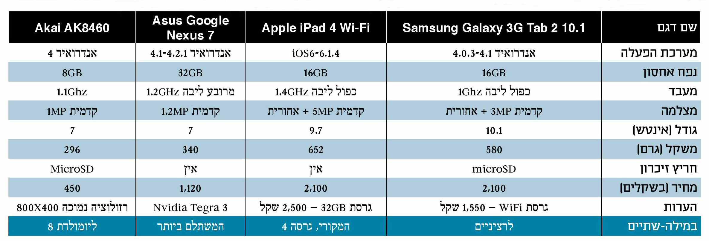 טווח המחירים נע בין 400 שקלים למכשיר של מותג אלמוני בגודל 7 אינטש עם נפח אחסון מצומק (ומצ'וקמק) ועד 4,000 שקלים לטאבלט עם נפח זיכרון של 64 ג'יגה-בייט ותמיכה בדור רביעי (שעדיין לא שמיש בארץ).