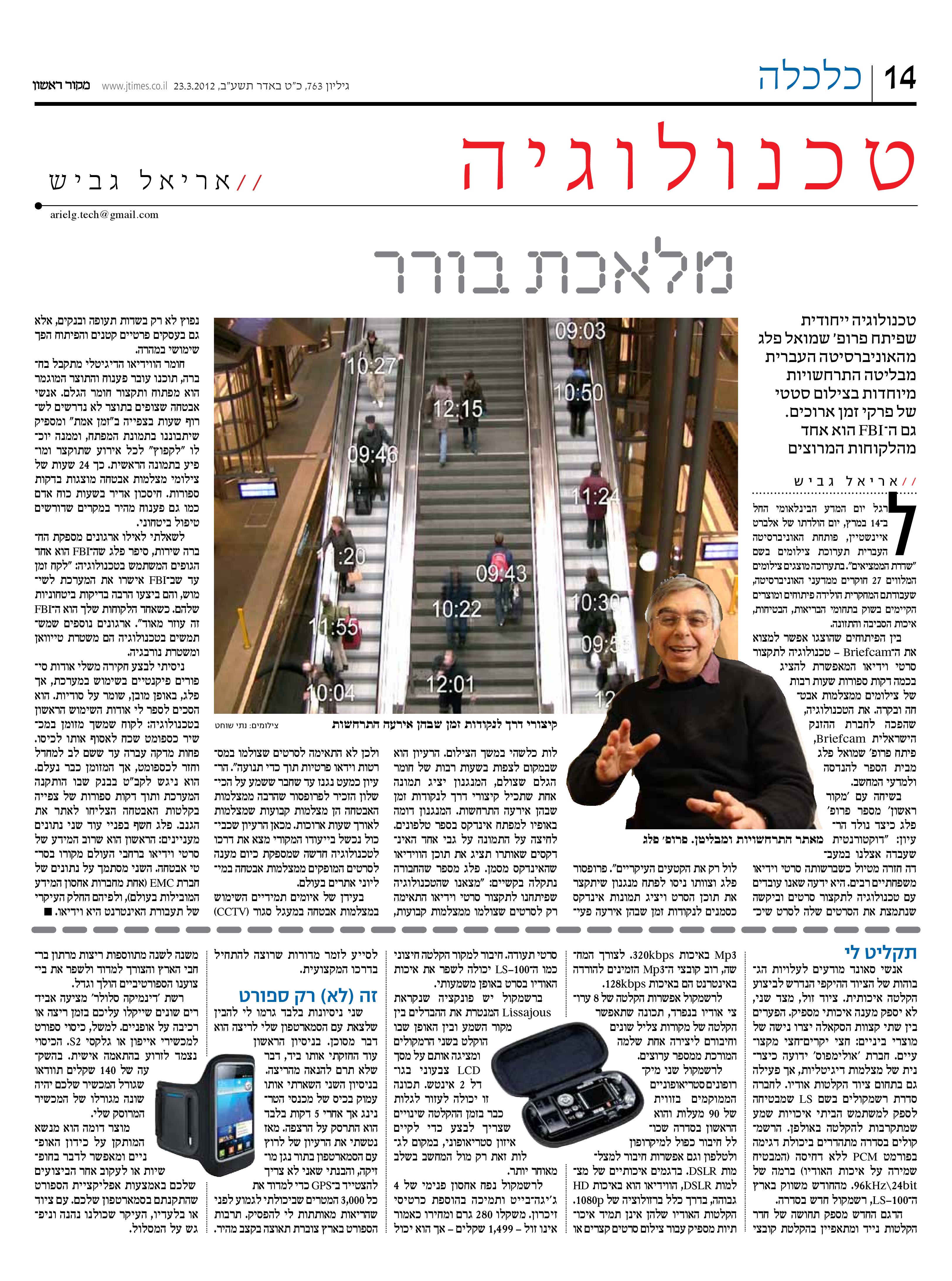 ניסיתי לבצע חקירה משלי אודות סיפורים פיקנטיים בשימוש במערכת, אך פלג, באופן מובן, שומר על סודיות. הוא הסכים לספר לי אודות השימוש הראשון בטכנולוגיה: לקוח שמשך מזומן במכשיר כספומט שכח לאסוף אותו לכיסו. פחות מדקה עברה עד ששם לב למחדל וחזר לכספומט, אך כמובן שהמזומן כבר נעלם. הוא ניגש לקב"ט בבנק בו הותקנה המערכת ותוך דקות ספורות של צפייה בקלטות האבטחה הצליחו לאתר את הגנב. פלג חשף בפניי עוד שני נתונים מעניינים: הראשון הוא שרוב המידע של סרטי וידיאו ברחבי העולם מקורו בסרטי אבטחה. השני מסתמך על נתונים של חברת EMC (אחת מחברות אחסון המידע המובילות בעולם) לפיהם החלק העיקרי של תעבורת האינטרנט היא וידיאו.