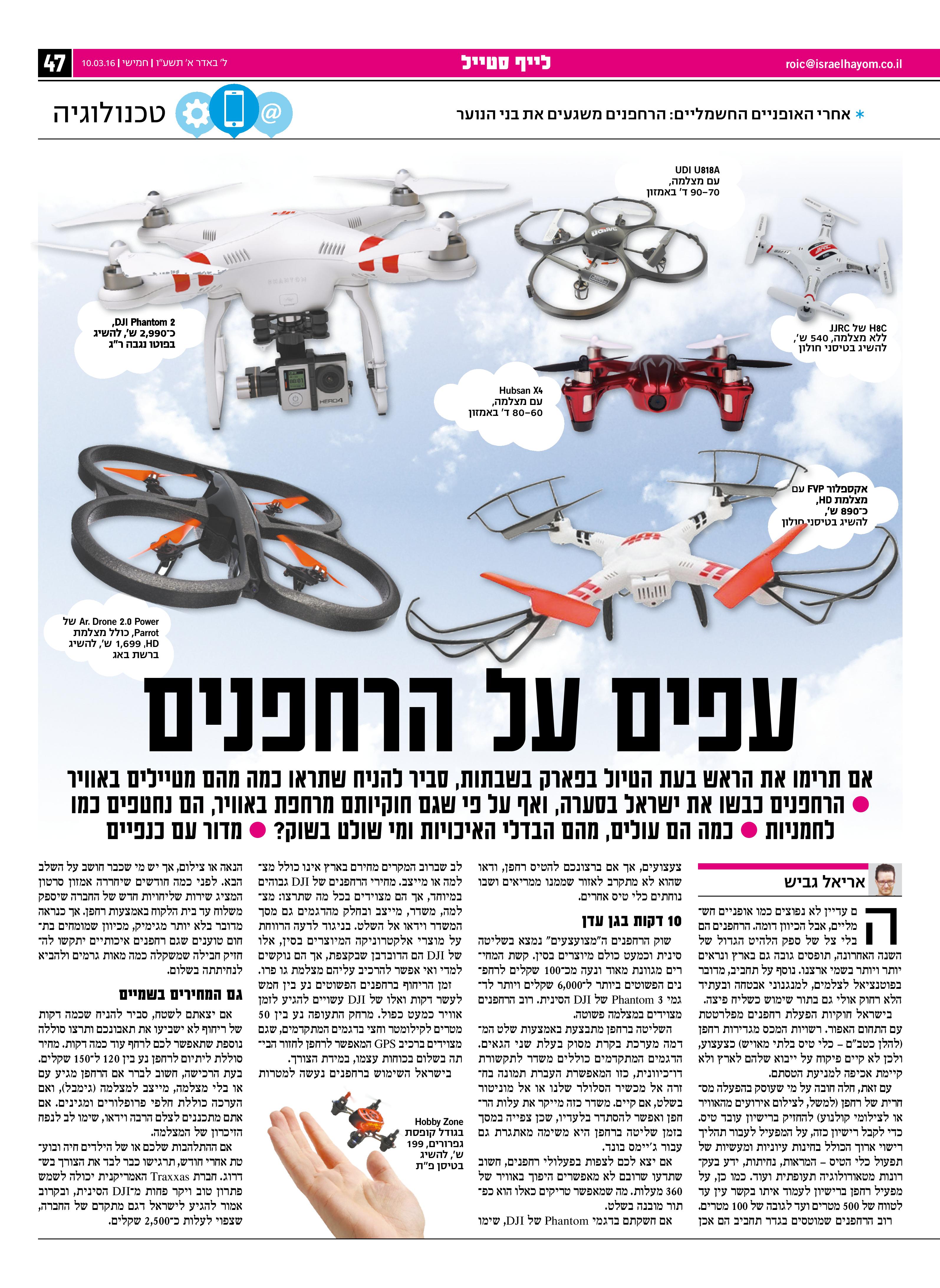הם עדיין לא נפוצים כמו אופניים חשמליים, אבל הכיוון דומה. הרחפנים הם בלי צל של ספק הלהיט הגדול של השנה האחרונה, תופסים גובה גם בארץ ונראים יותר ויותר בשמי ארצנו. נוסף על תחביב, מדובר בפוטנציאל לצלמים, למנגנוני אבטחה ובעתיד הלא רחוק אולי גם בתור שימוש כשליח פיצה.