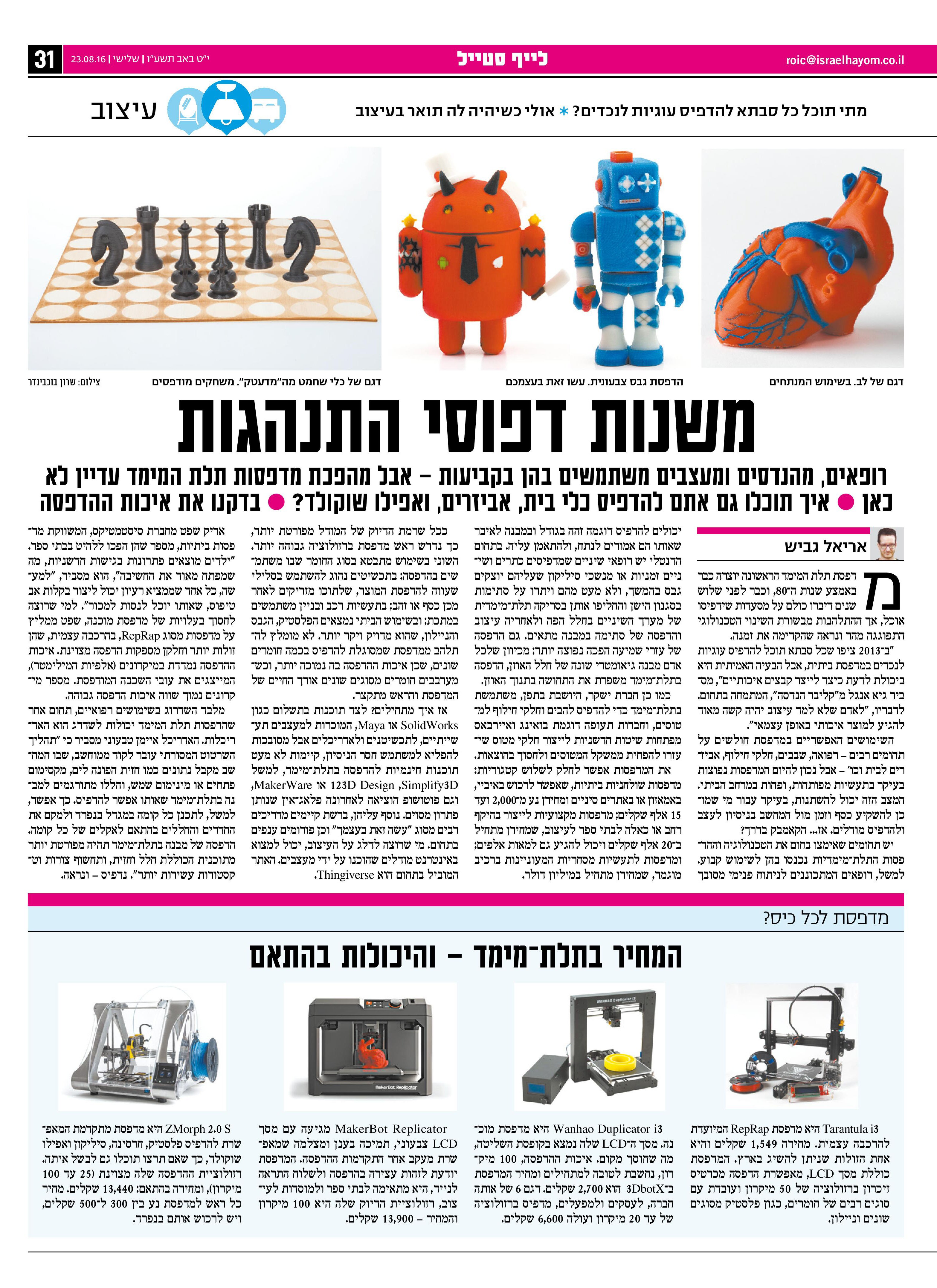 אריק שפט מחברת סיסטמטיקס, המשווקת מדפסות ביתיות, מספר שהן הפכו ללהיט בבתי ספר. "ילדים מוצאים פתרונות בגישות חדשניות, מה שמפתח מאוד את החשיבה", הוא מסביר, "למעשה, כל אחד שממציא רעיון יכול ליצור בקלות אב טיפוס, שאותו יוכל לנסות למכור". למי שרוצה לחסוך בעלויות של מדפסת מוכנה, שפט ממליץ על מדפסות מסוג RepRap, בהרכבה עצמית, שהן זולות יותר וחלקן מספקות הדפסה מצוינת. איכות ההדפסה נמדדת במיקרונים (אלפיות המילימטר), המייצגים את עובי השכבה המודפסת. מספר מיקרונים נמוך שווה איכות הדפסה גבוהה.