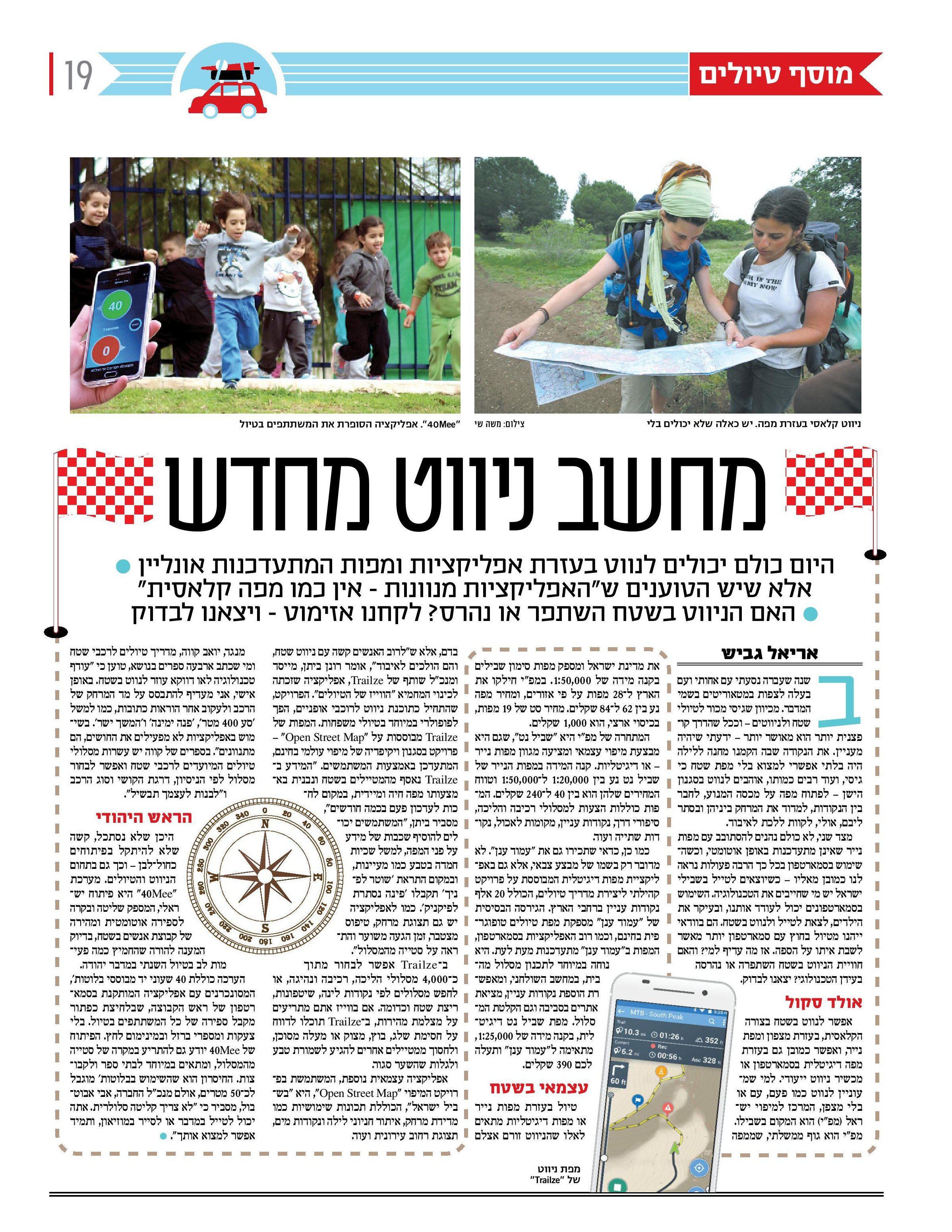 טיול בעזרת מפות נייר או מפות דיגיטליות מתאים לאלו שהניווט זורם אצלם בדם, אלא ש"לרוב האנשים קשה עם ניווט שטח, והם הולכים לאיבוד", אומר רונן ביתן, מייסד ומנכ"ל שותף של Trailze, אפליקציה שזכתה לכינוי המחמיא "הווייז של הטיולים". הפרויקט, שהתחיל כתוכנת ניווט לרוכבי אופניים, הפך לפופולרי במיוחד בטיולי משפחות. המפות של Trailze מבוססות על "Open Street Map" – פרויקט בסגנון ויקיפדיה של מיפוי עולמי בחינם, המתעדכן באמצעות המשתמשים. "המידע ב־Trailze נאסף מהמטיילים בשטח ונבנית באמצעותו מפה חיה ומיידית, במקום לחכות לעדכון פעם בכמה חודשים", מסביר ביתן, "המשתמשים יכולים להוסיף שכבות של מידע על פני המפה, למשל שכיות חמדה בטבע כמו מעיינות, ובמקום התראת 'שוטר לפניך' תקבלו 'פינה נסתרת לפיקניק'. כמו לאפליקציה יש גם תצוגת מרחק, טיפוס מצטבר, זמן הגעה משוער והתראה על סטייה מהמסלול".